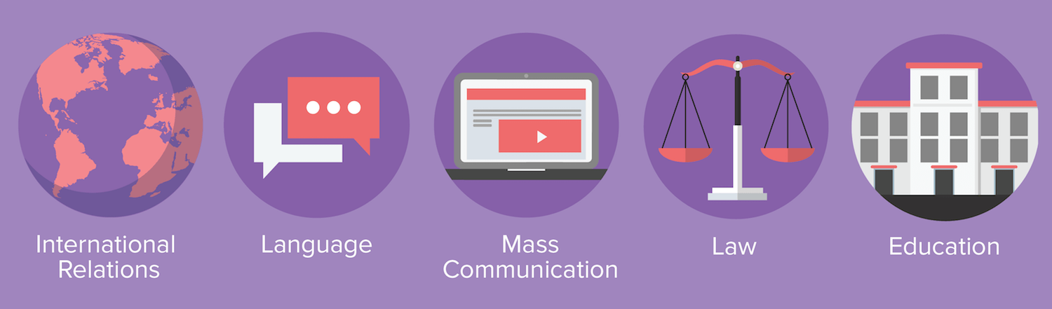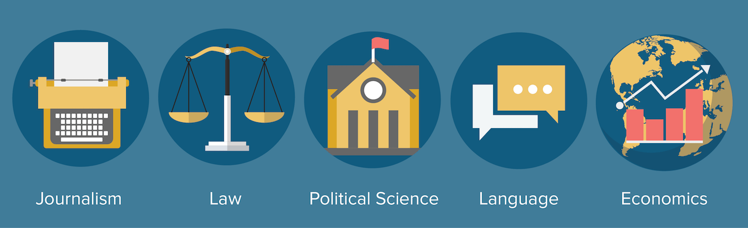 Degrees that you can consider include: journalism (a major under mass communication), law, political science, anthropology, language, economics and education.