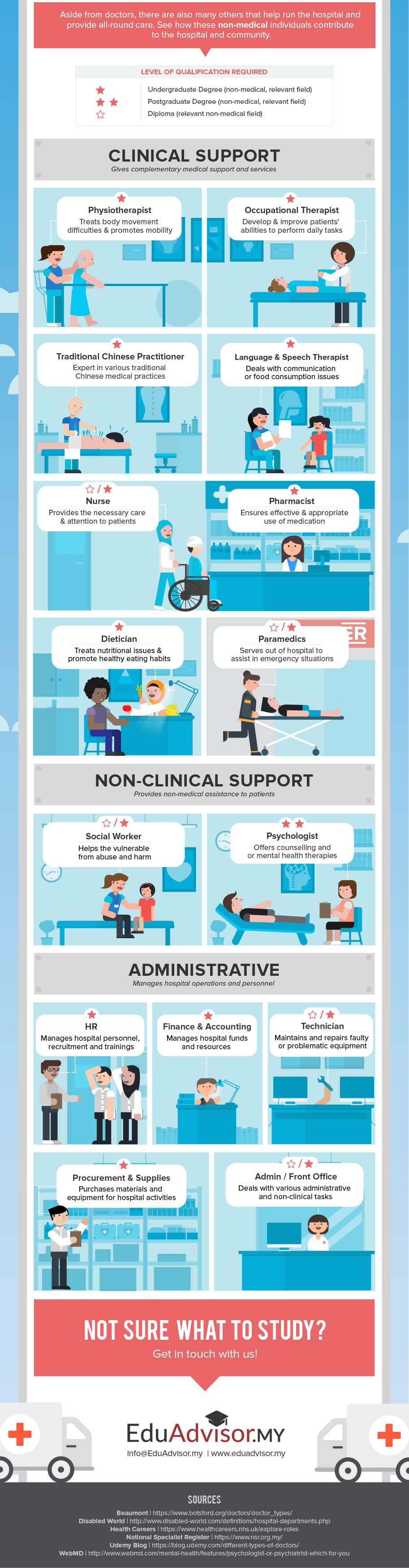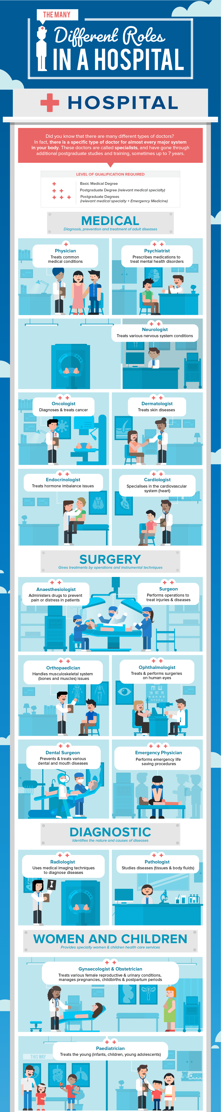 Are doctors the only one working in a hospital? What other roles can you play in a hospital even if you do not have a medical degree? Join us as we explore the different roles that are present in a hospital with our infographic here.